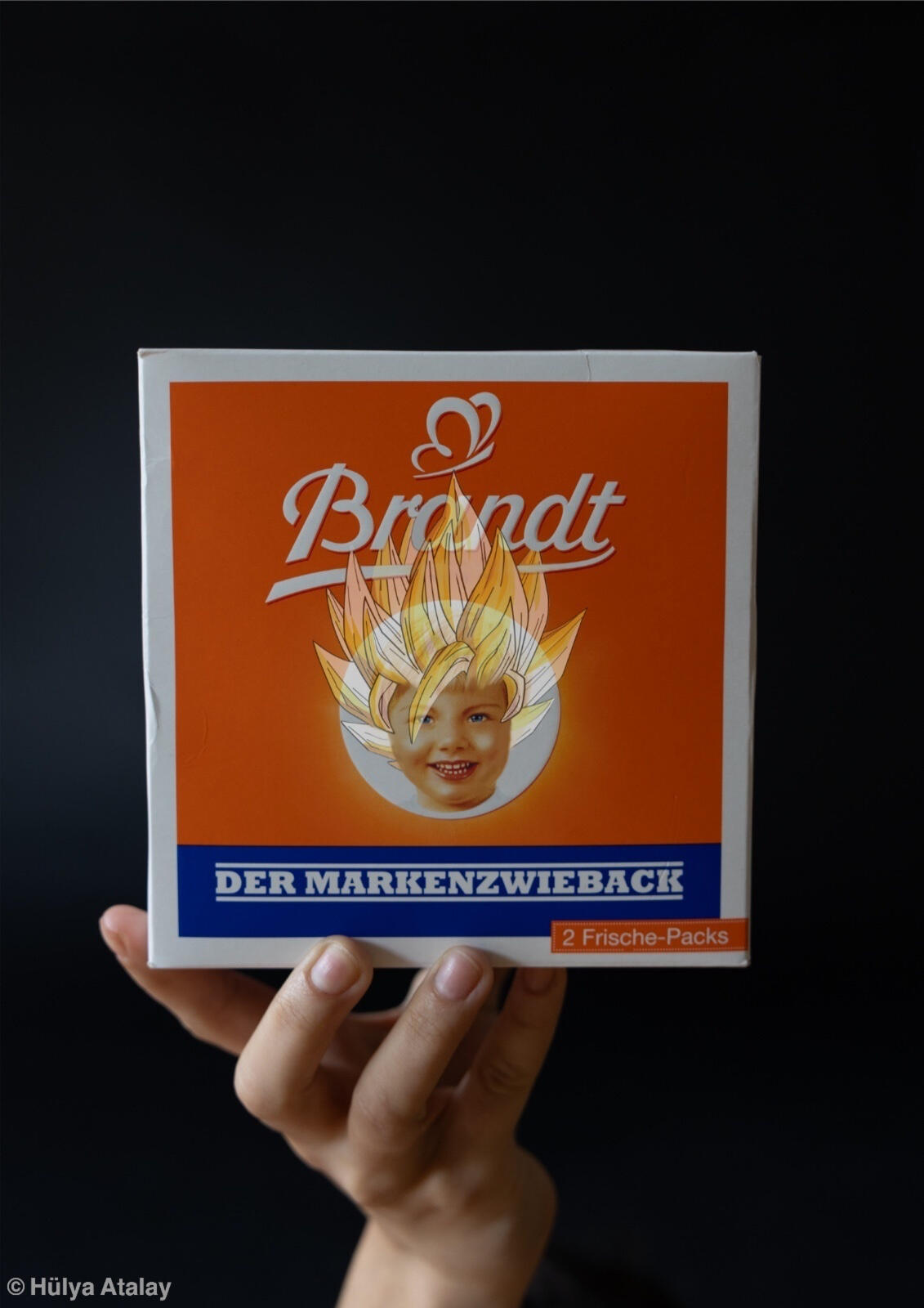 The Japanese anime Dragon Ball Z from the 1980s is part of Germany’s pop-cultural memory. It raises questions about why the German visual media landscape remains permeated by imperial and colonial narratives.I grew up in the early 2000s. Before smartphones, many diasporic parents were accused of 'parking' their children in front of the TV, of exposing them to too much violence.Now, as an adult, I wonder why others rarely reflect on how violence—often stylized or cartoonish—was normalized, appearing both on the packaging of childhood products and across the visual culture that shaped us.--- A wordplay referencing the family name Brandt—the brand behind German Zwieback (rusk) production.During World War II, Zwieback was considered a “war food” for Nazi soldiers due to its long shelf life. In the post-war years, it remained a staple in German households amid raw material shortages. The baked good thus became a childhood memory for a generation shaped by war and its aftermath—a nostalgic material.There are no statements on the official Brandt family website, nor in any other sources, regarding the forced laborers who, between 1939 and 1945, were compelled to produce Zwieback in large quantities in Hagen.The identifying feature of Brandt Zwieback packaging is a smiling, blonde child—a 1989 graphic continuing earlier versions since 1929, idealizing the notion of “the healthy child.”Zwieback is still recommended for digestive issues and thus carries additional meanings. In this photograph, I present the Zwieback package as a commercial product, held in front of the camera by a hand reminiscent of Apple product photography. The hairstyle remains blonde, but here it is borrowed from the anime protagonist Son Goku of Dragon Ball Z. He is also blonde—but only in his “advanced” form. In the anime’s narrative, Son Goku is depicted as half-human, half-ape—a racialized storyline.