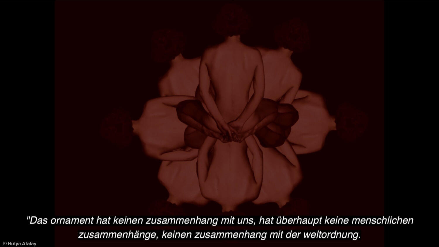 The video opens with quotes arranged in a triangular movement across the screen. Praying gestures, adopted from cinematic conventions, appear — often interpreted as religious, specifically Christian, signs. The quotes build gradually, beginning with Adolf Loos’s patriarchal view on sex in 'Ornament und Verbrechen', which frames male penetration upon the cross as an “original” ornament.By repeating the white cross against a black screen, a mocking gesture is being built up gradually . Subtitles move with the images, integrating scripture into the visual flow and establishing a rhythm that carries into the movement of repetition. Repetition underlies both litany and the notion of "ornament". Historically, western academics described so-called “primitive” patterns as less valuable than christian, iconographic images, despite their own repetition — a concept applicable to liturgical speech.Building on repetition, the video introduces layered voices: a turkish reading voice paired with a german repeating voice. This opens an acoustic space previously silent, while the turkish text, from Elif Şafak’s Pinhan, retains its autonomy and gender-fluid perspective. As the german voice enters subtly, it forms a whispering texture. Repetition of terms such as “a repetition,” “an original,” “a copy” are mocking the embodiment of speech: language is often reproduced rather than internally generated, raising the question of whether we speak or are spoken by language itself.
